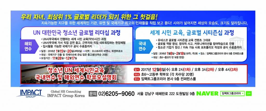 임팩트그룹코리아에서 청소년들을 위한 국내연수 및 해외연수 과정을 운영하오니 많은 참여를 바랍니다.