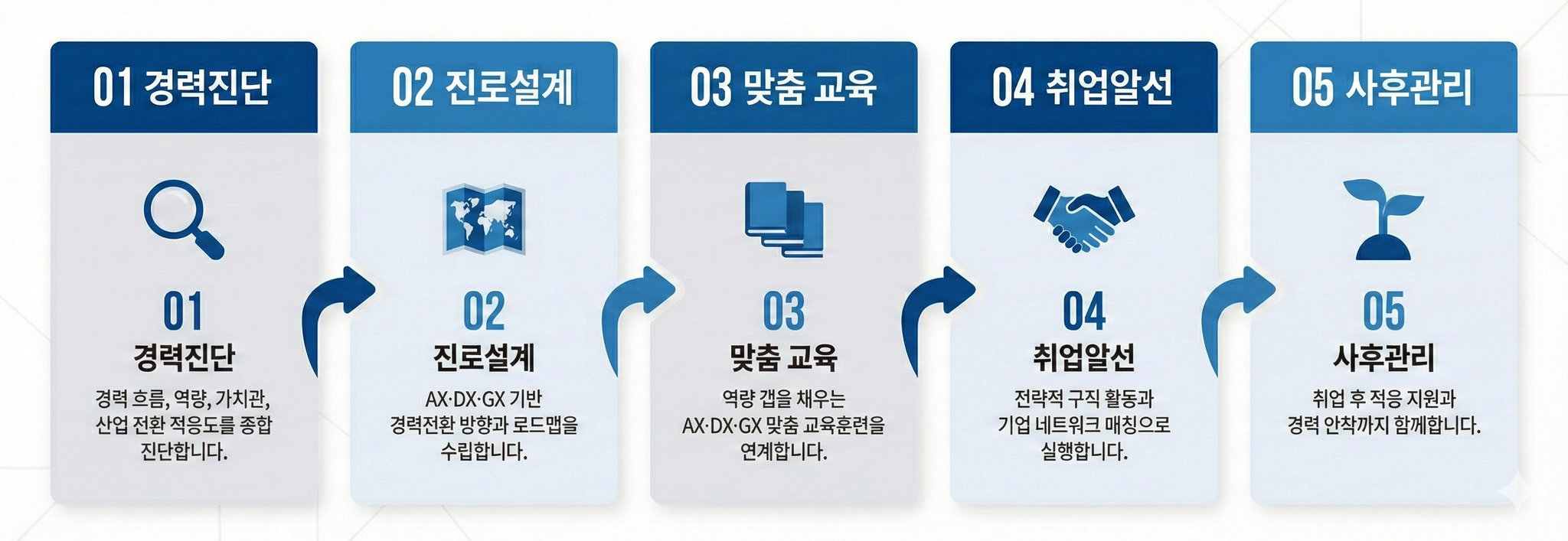 이력서 한 장이 아닌 전략적 구직 활동이 필요합니다. 산업전환 흐름에 맞는 숨은 일자리를 발굴하고 실질적인 취업을 만들어냅니다.