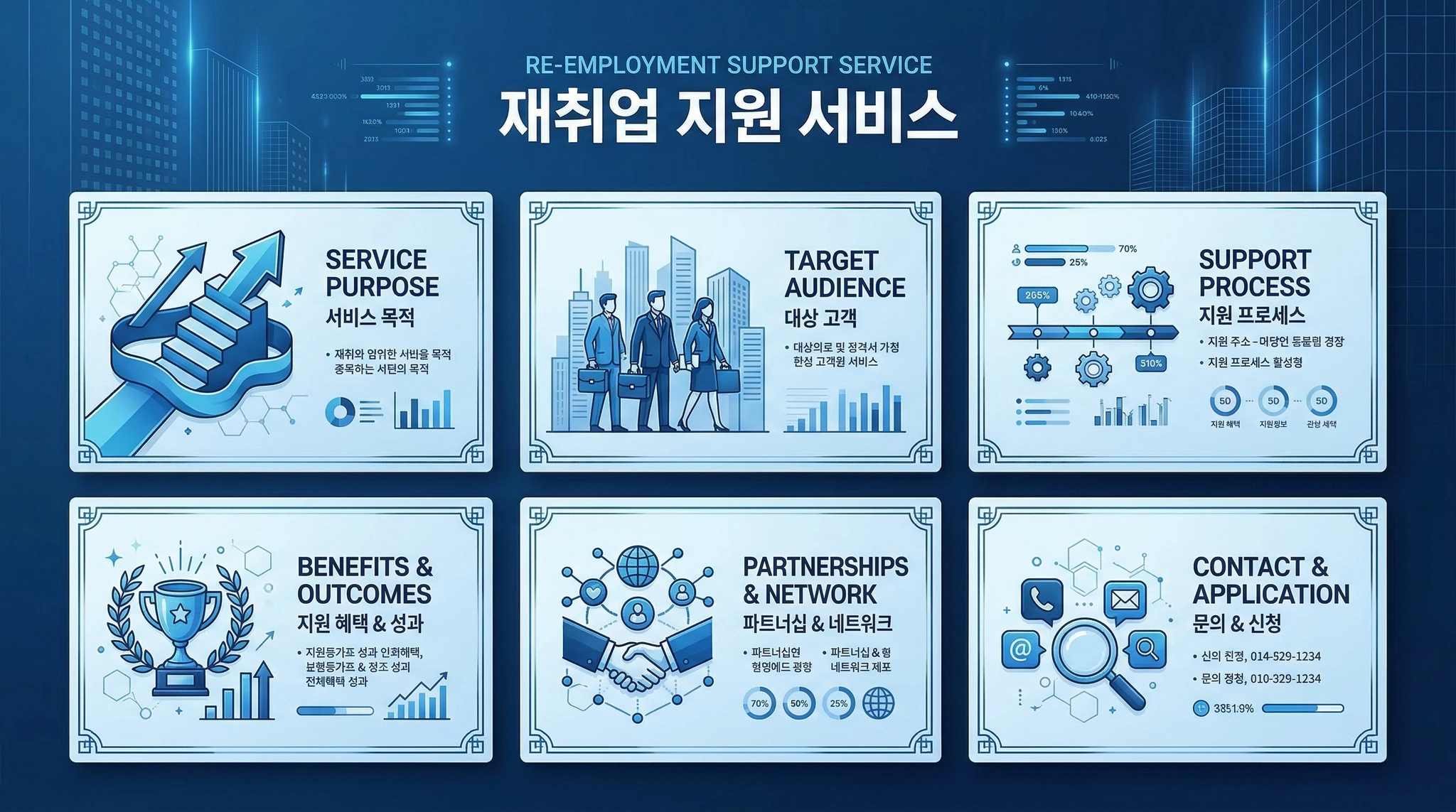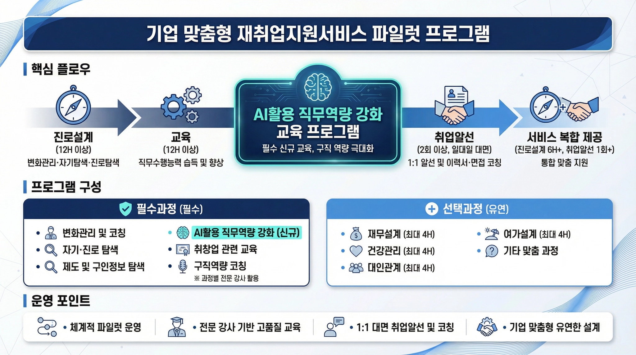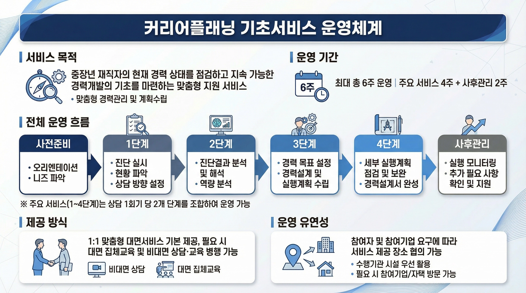 또한 재취업지원서비스의 큰 틀 안에서 진로설계, 교육, 취업알선, 복합 제공의 흐름을 함께 고려해 커리어플래닝이 단발성 상담이 아니라 실행력 있는 개인/조직 지원 프로그램이 되도록 돕습니다.