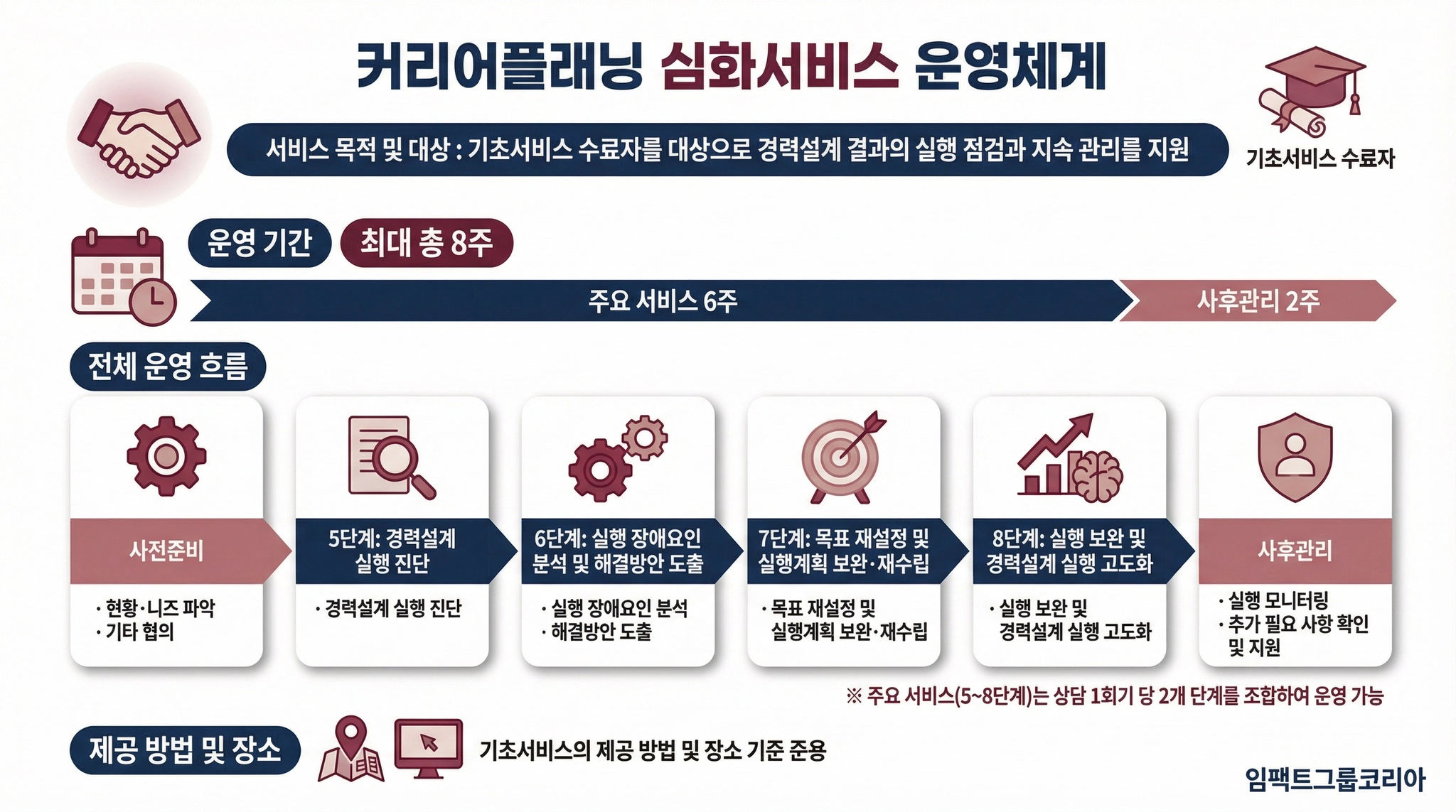 기초서비스를 통해 도출된 경력설계 결과를 바탕으로 실행을 점검하고, 장애요인을 보완하며, 목표 재설정과 사후관리까지 연결합니다. 임팩트그룹코리아는 개인의 성장과 변화가 실제 실행으로 이어지도록 돕습니다.