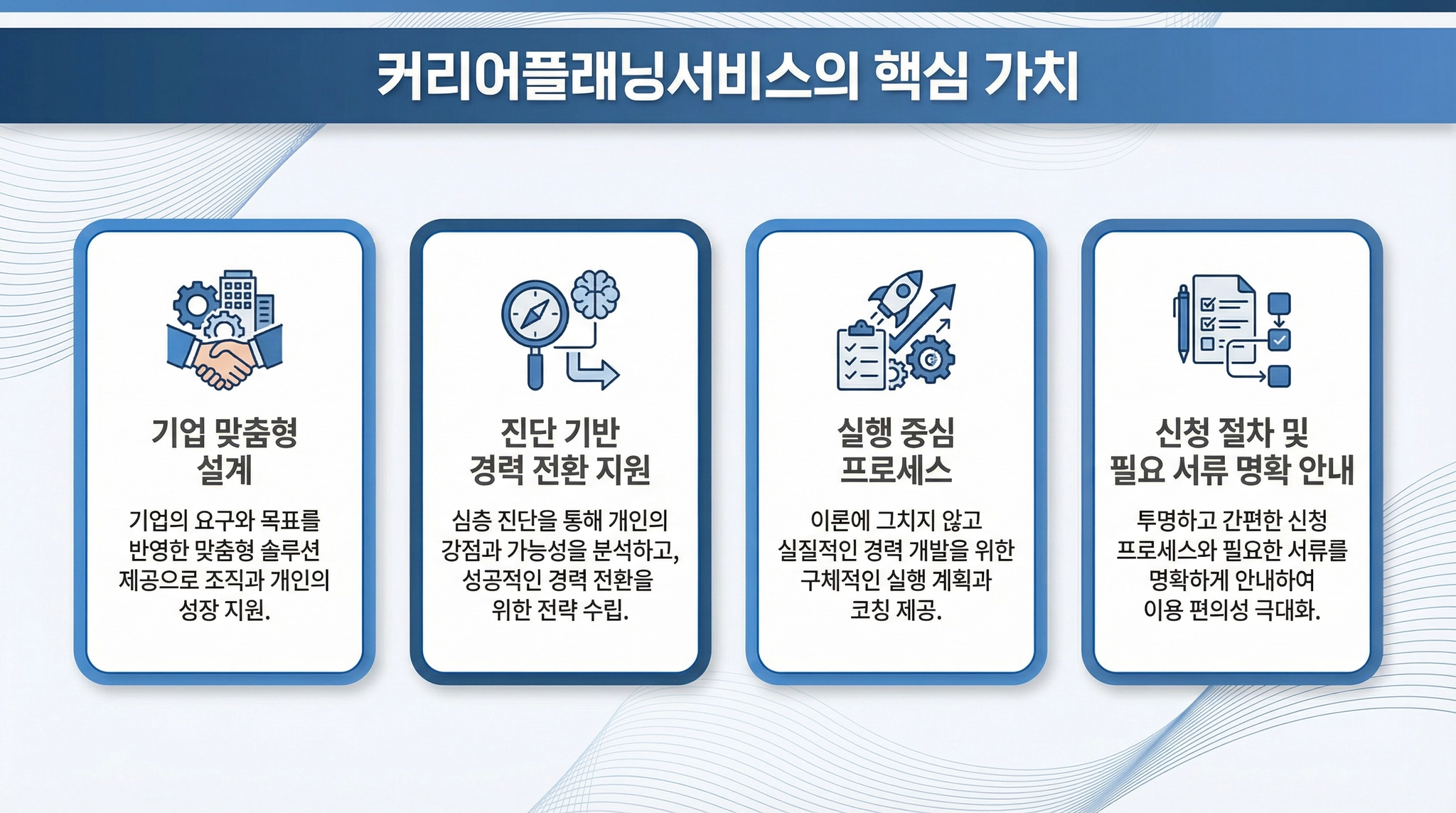 커리어플래닝서비스는 어렵고 번거로운 절차가 아니라, 진단부터 경력 설계, 실행 지원, 신청 안내까지 한 흐름으로 정리된 실무형 지원 서비스입니다.
