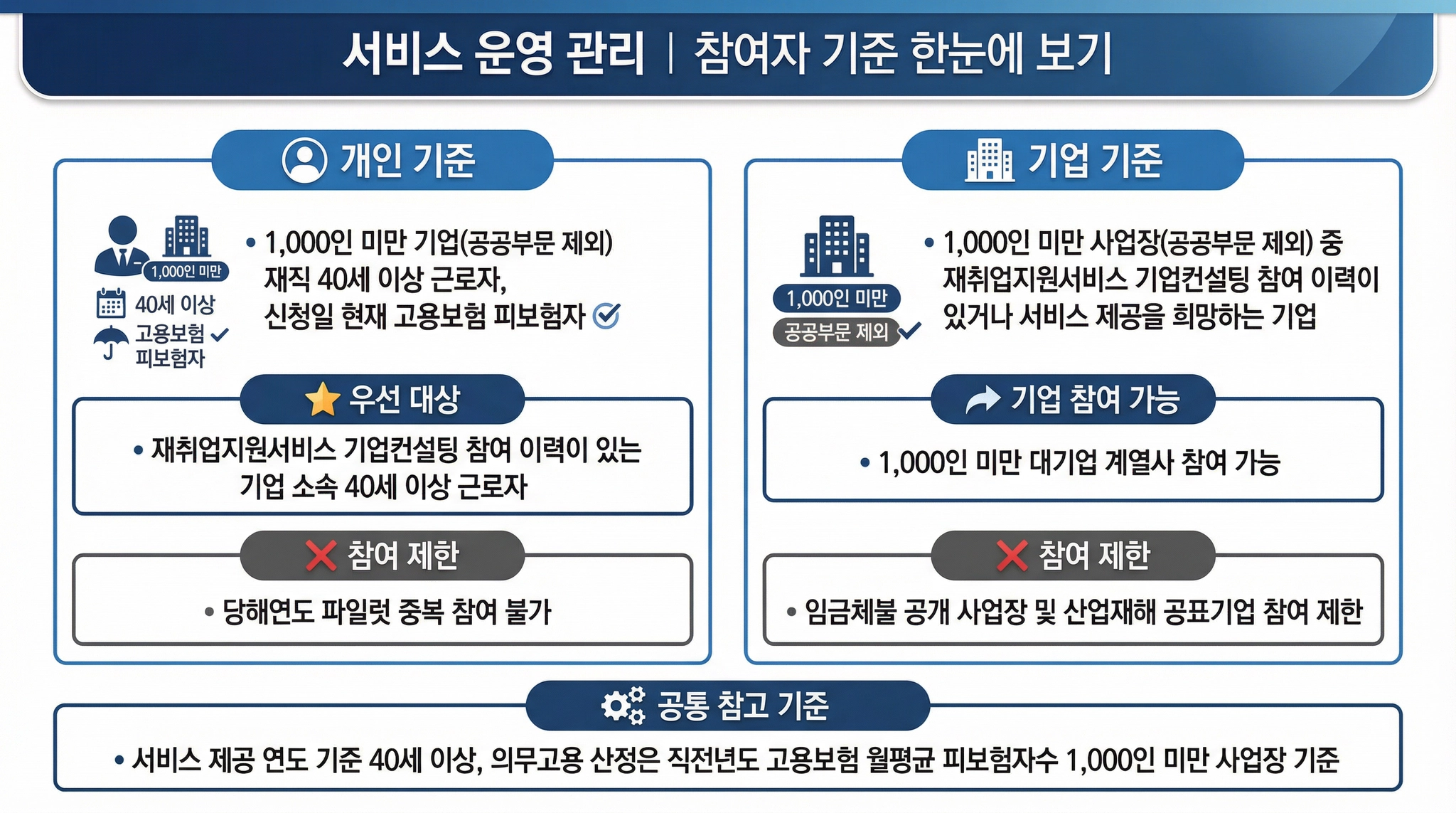 개인과 기업의 참여 기준, 우선 대상, 제한 사항까지 한 번에 확인할 수 있도록 정리했습니다. 1,000인 미만 사업장, 40세 이상 근로자, 공공부문 제외 여부 등 핵심 조건을 기준으로 신청 가능 여부를 빠르게 검토할 수 있습니다.