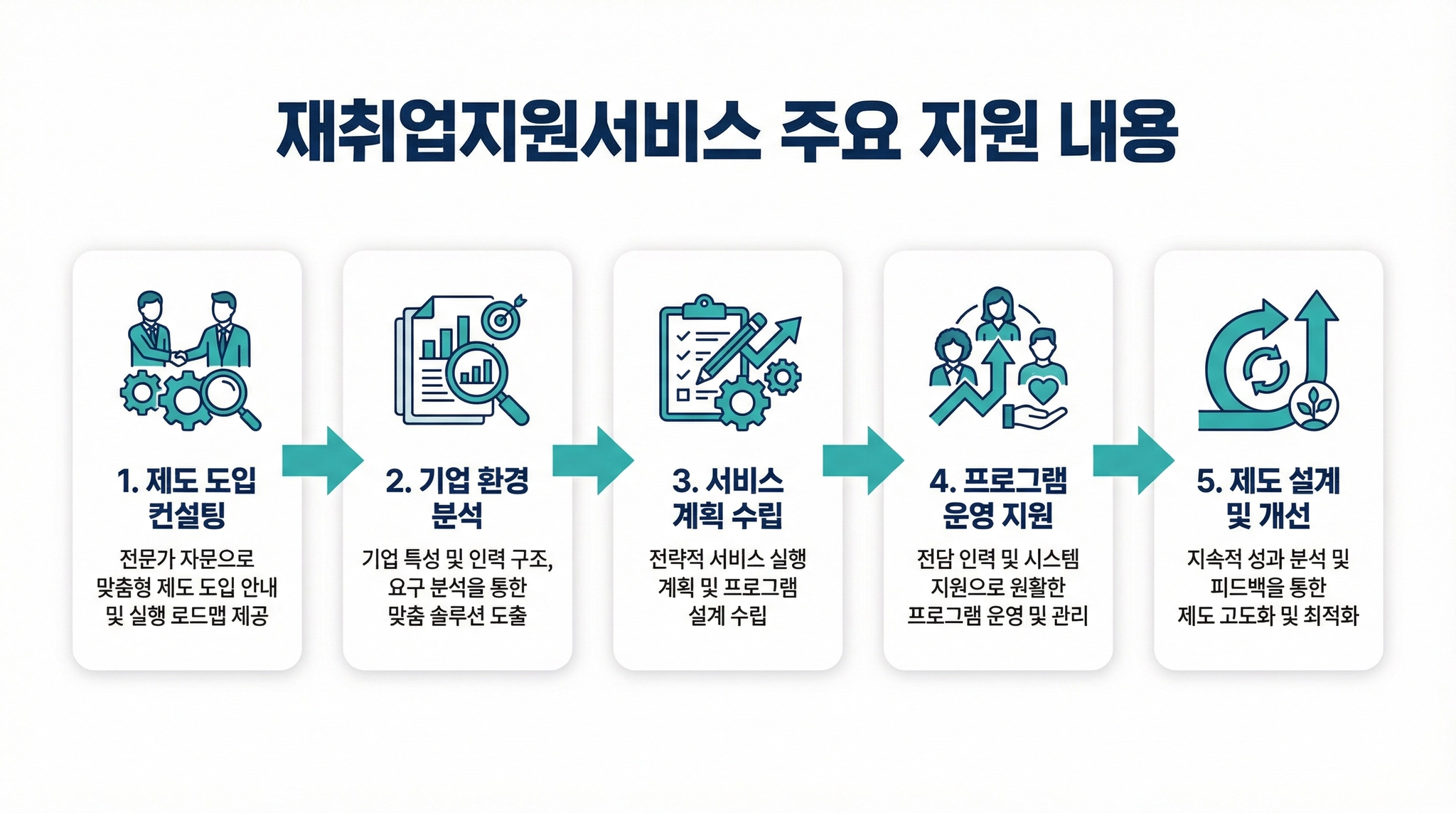 재취업지원서비스는 기업의 현황을 진단하고, 적합한 운영 방향을 설계한 뒤, 실제 적용과 운영 정착까지 단계적으로 지원하는 방식으로 진행됩니다.