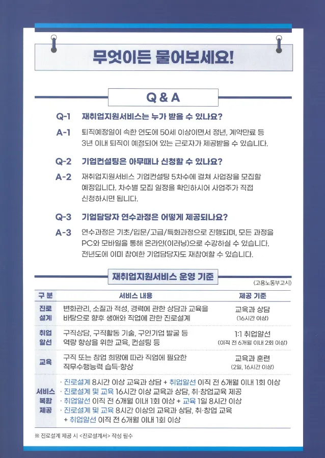 대통령령으로 정하는 일정규모 이상 기업(예시: 1,000인 이상)은 50세 이상 비자발적 이직 예정자를 대상으로 재취업지원서비스 제공을 의무화하여 바람직한 서비스 모델을 확산할 수 있도록 하였다.