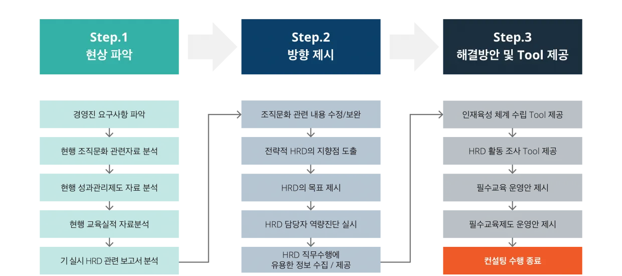 고객사의 조직 내 이슈에 대응하는 교육훈련체계 수립, 교육과정 개발 등 기획 중심의 HRD 컨설팅 서비스와 교육과정 코디네이팅 및 운영 등 HRD 프로그램 서비스를 제공합니다.