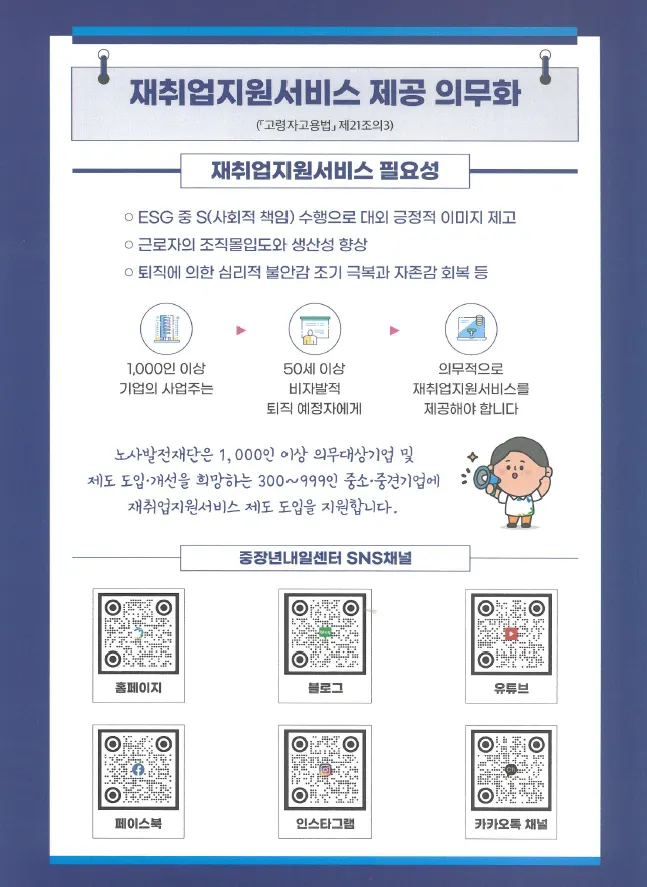 대통령령으로 정하는 일정규모 이상 기업(예시: 1,000인 이상)은 50세 이상 비자발적 이직 예정자를 대상으로 재취업지원서비스 제공을 의무화하여 바람직한 서비스 모델을 확산할 수 있도록 하였다.