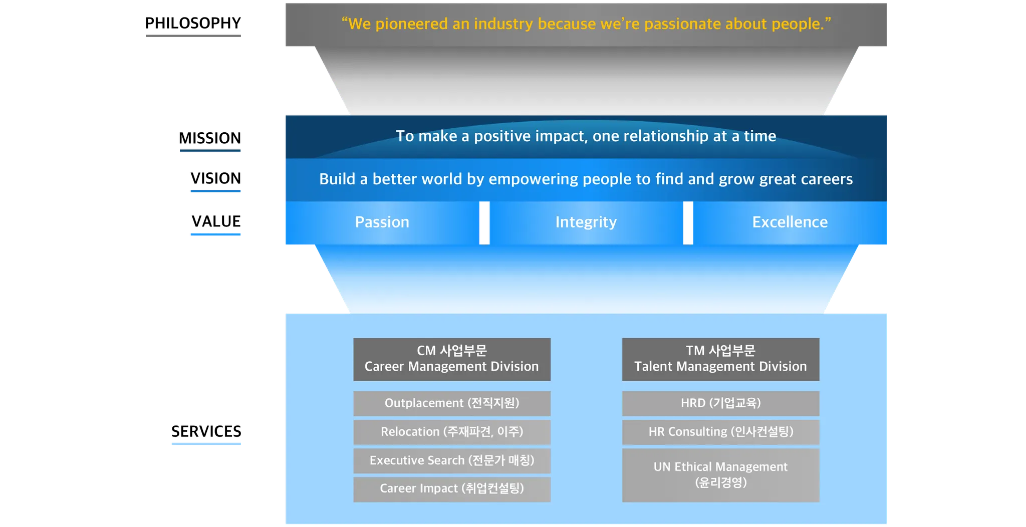 우리는 글로벌 경력관리 및 인재개발 컨설팅 기업으로서, 전 세계 71개국, 200여 지사를 운영하며, FORTUNE 1000대 기업들을 고객사로 확보하고 있습니다. 우리의 철학은 고객사 임직원 개개인에 대한 경력 코칭과 전직 훈련, 기업가정신 프로그램을 통해 개인에게 긍정적인 영향과 함께 한 단계 성장할 수 있도록 질 높은 서비스를 제공하는 것입니다.